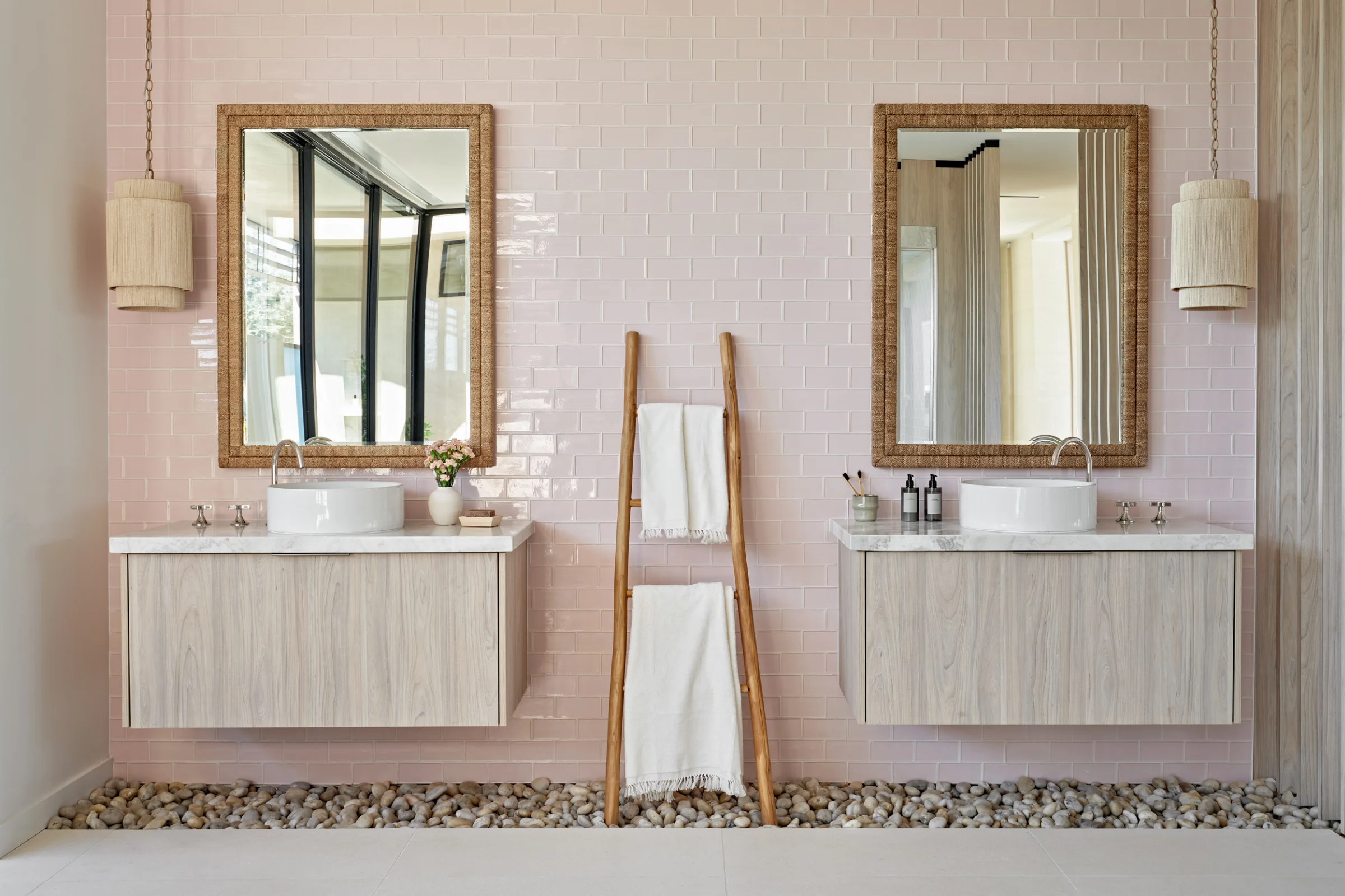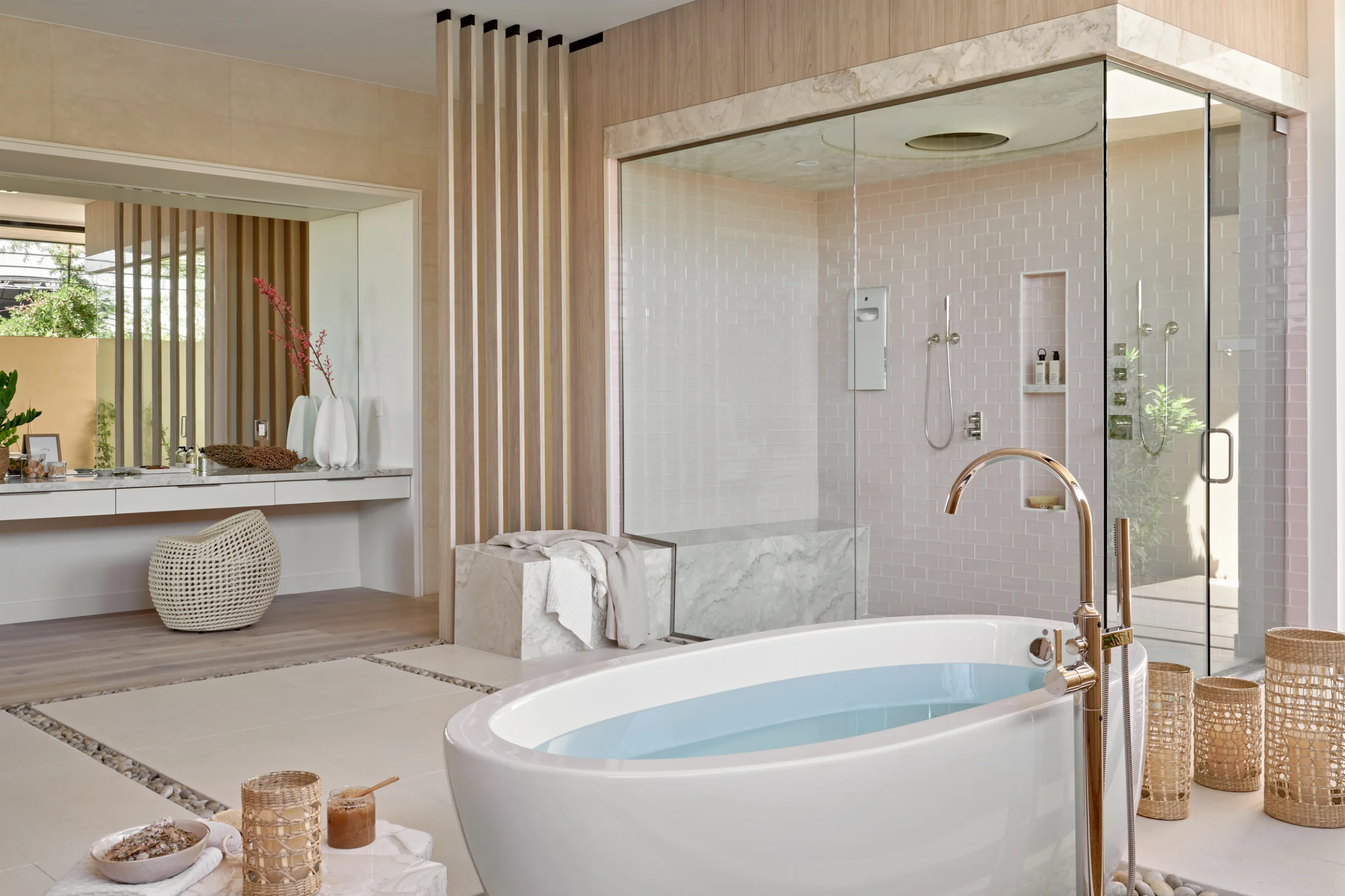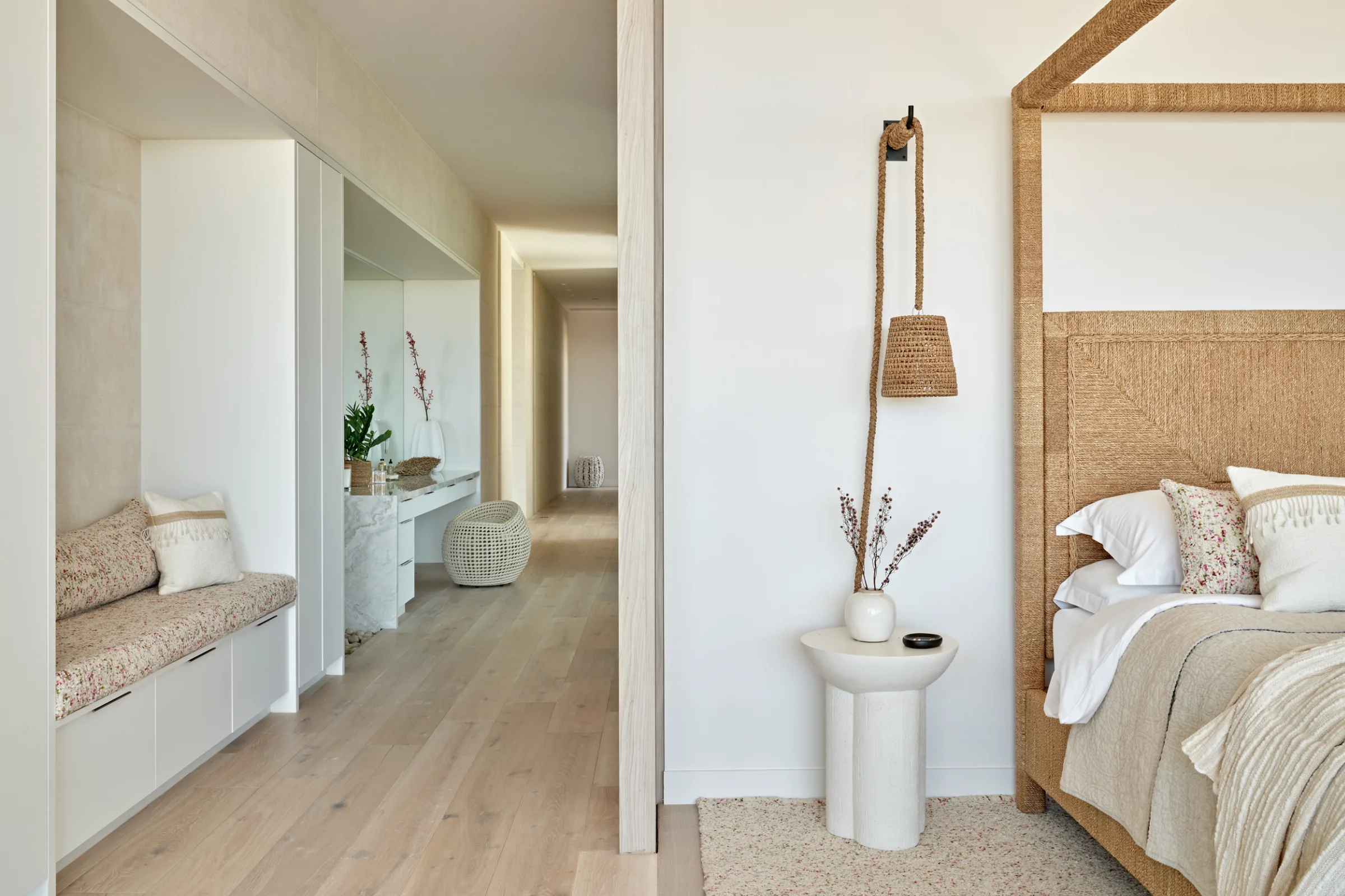 Our client envisioned a Maldivian spa-like atmosphere, emphasising natural textures and an organic feel throughout the property.